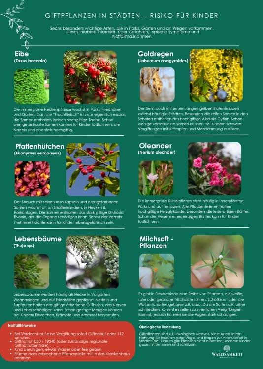 Informatives A3-Poster mit den sechs wichtigsten Giftpflanzen, die häufig in Städten, Gärten und auf dem Gelände verschiedener Einrichtungen vorkommen. Zeigt auf einen Blick Gefahren, Symptome und Notfallmaßnahmen – Ideal für Kindergärten, Schulen, Eltern und Vereine, um Kinder sicher durch den Alltag zu begleiten. Klar gestaltet, wissenschaftlich fundiert und leicht verständlich – für Aufklärung statt Panikmache.